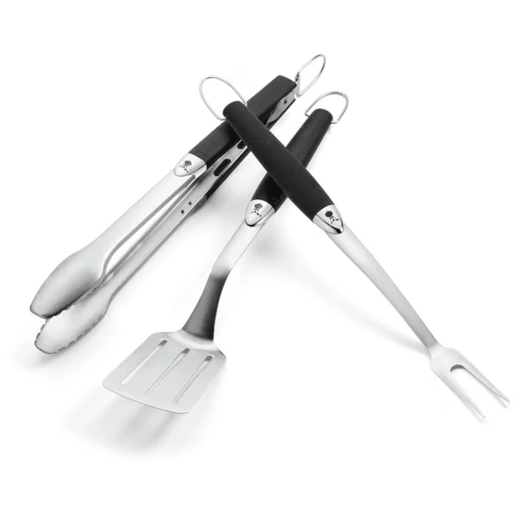 Ga voor de kit waar alles in zit: de drie cruciale barbecuegereedschappen waarmee het draaien van burgers en worstjes en het verplaatsen van braadstukken een fluitje van een cent is. De Premium Tool Set van 46 centimeter bevat een gebogen roestvrijstalen spatel, vergrendelbare tang en een vleesvork, allemaal met soft-touch handgrepen die zorgen voor een comfortabele, antislip-grip. Gebruik het unieke, handige ontgrendelingsmechanisme van de tang om hem te openen: tik simpelweg het bovenste uitstekende gedeelte tegen uw heup met de ene hand terwijl u in de andere een bord vasthoudt. De robuuste spatel en vleesvork zijn sterk genoeg om zware braadstukken met gemak van de barbecue naar het bord te verplaatsen. Dankzij de metalen hangbeugels hangt u uw gereedschap met gemak op: zo blijven ze schoon, en altijd klaar om te barbecueën. Wanneer de tang niet is gebruik is kunt u hem vergrendelen zodat hij compact opbergbaar is. De Premium Tool Set is even duurzaam als fraai en functioneel, en bovendien ook vaatwasserbestendig.